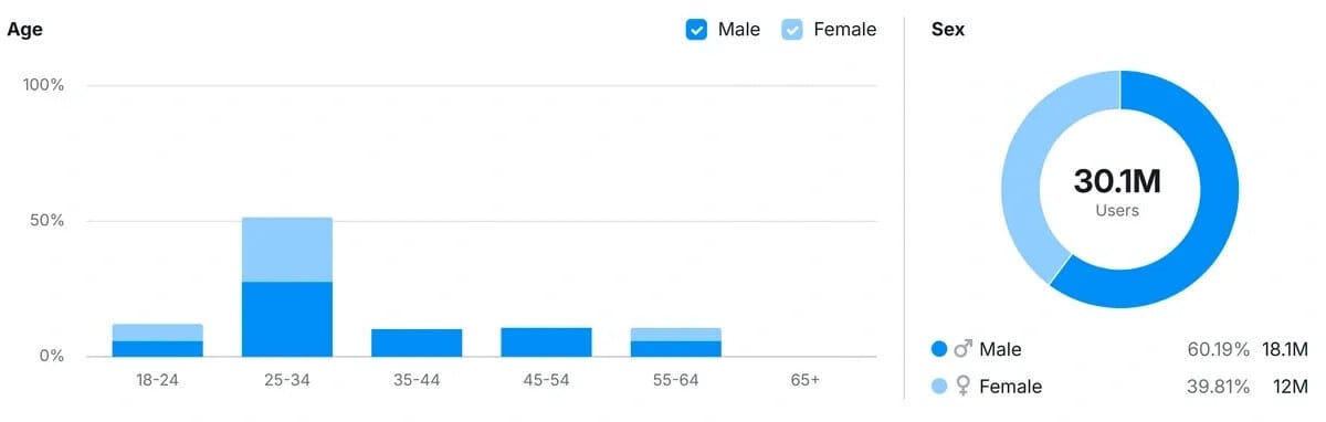 The interesting and potentially dangerous stats to pay attention to are the demographics that are using these platforms. For example, here is the breakdown of the 30 million monthly active users of Grok.