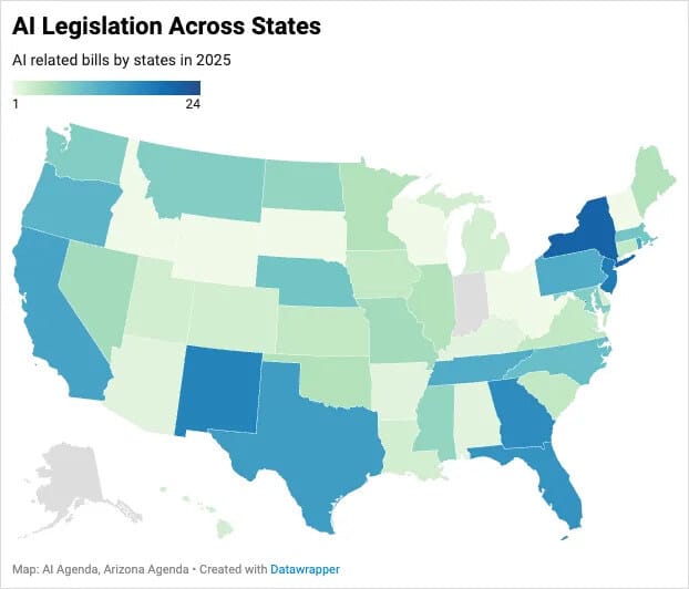 Arizona ranks much lower, with just eight AI-related bills introduced this year.