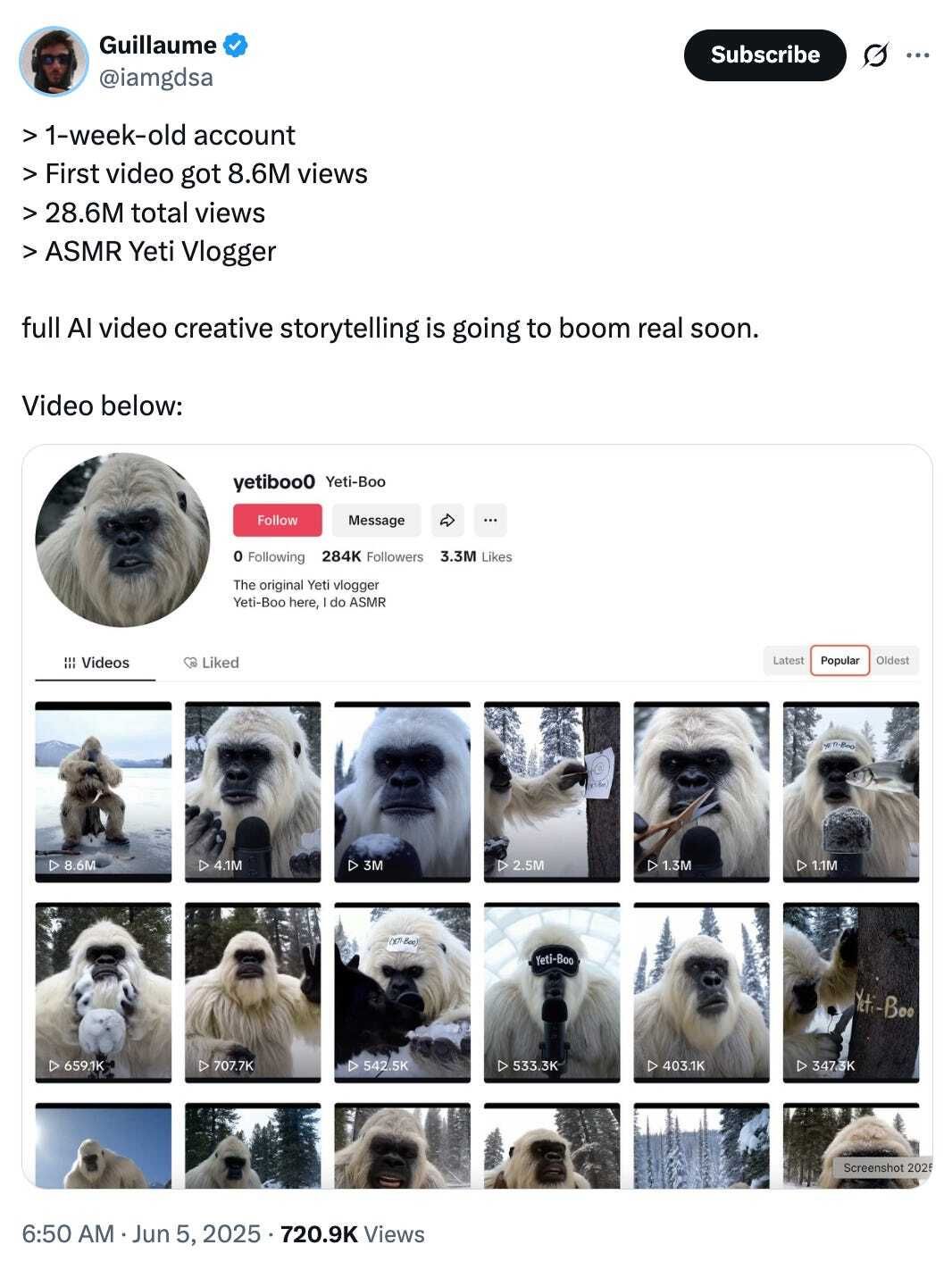 A Yeti goes mega-viral: A brand-new TikTok handle called “Yeti-Boo” blew past 28.6 million views in its first week thanks to a fully AI-generated, ASMR-style snow beast that vlogs from the woods. Zero followers → cult character in seven days is a reminder that low-cost synthetic actors can now win the algorithm all by themselves.