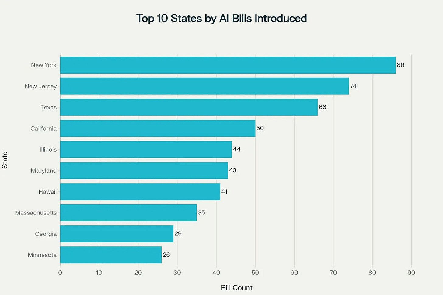 New York leads the legislative charge with 86 AI bills, followed closely by New Jersey with 74 and Texas with 66.