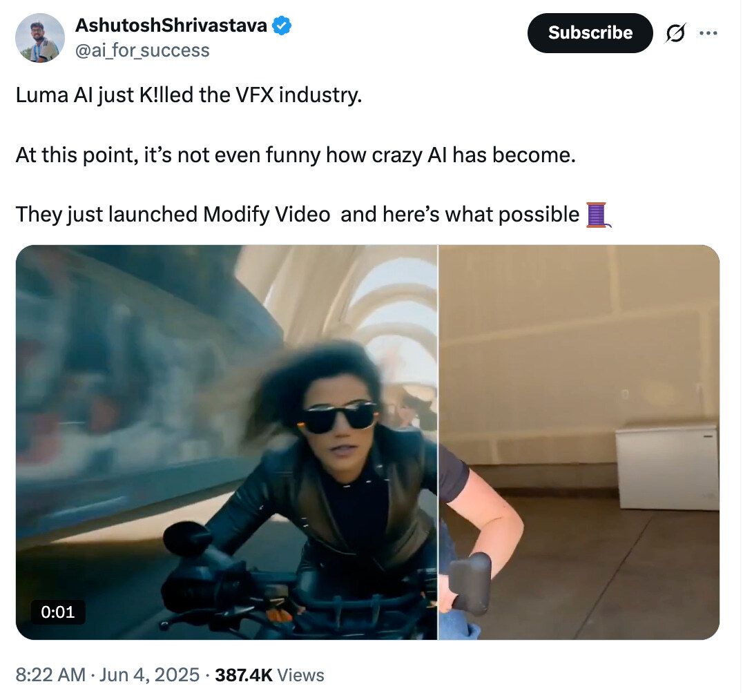 VFX in a click: Luma Labs’ new “Modify Video” lets filmmakers keep the original performance but swap in entirely new worlds — lighting, textures, even characters — in post. Think “shoot once, restyle infinitely,” and you’ll know why traditional VFX shops are sweating.