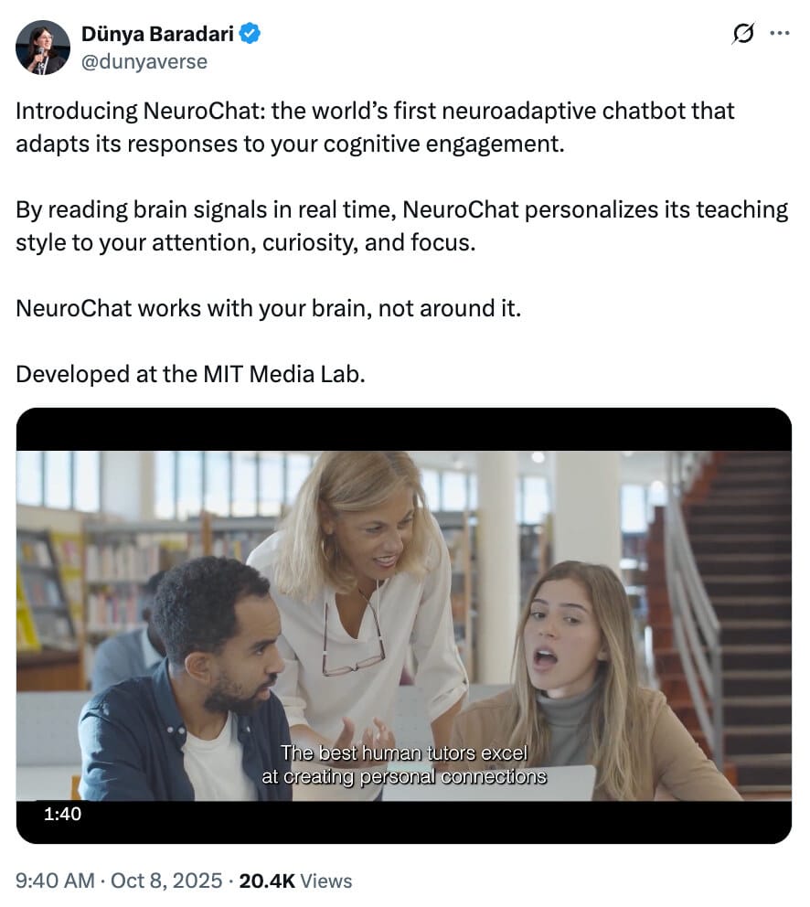 NeuroChat reads your mind: MIT’s new chatbot doesn’t wait for your words — it listens to your brain. By tracking focus and curiosity in real time, it adapts how it teaches and talks, making every chat feel more human. Researchers call it “neuroadaptive AI,” but it’s basically mind-reading for better conversation.