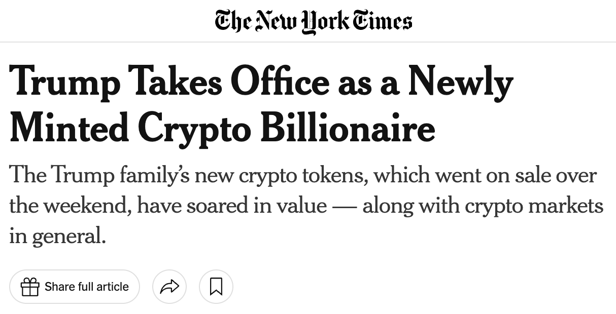 As the lines blur between political power and technological influence, crypto has become the symbol of this new gov/tech alliance, promising fortunes for those savvy (or shameless) enough to exploit it.