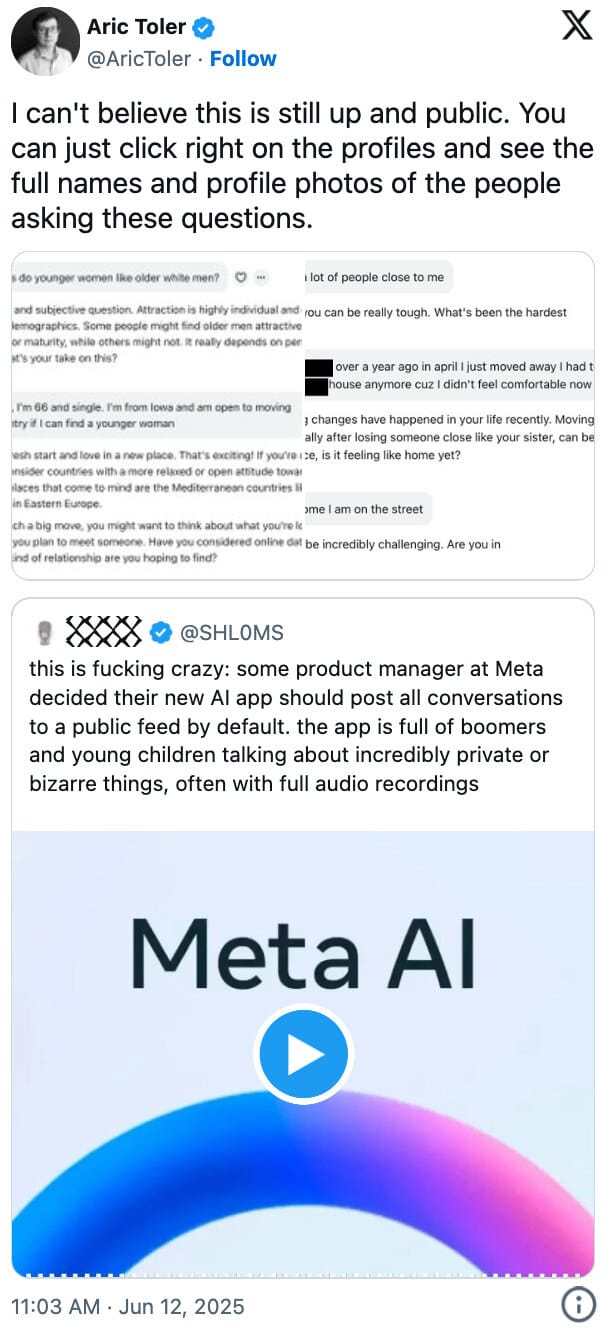 Meta AI privacy face-plant: New York Times visual-investigations reporter Aric Toler draws attention to the fact that the Meta AI app’s “Discover” feed still exposes users’ full names, profile photos, and painfully personal prompts — from medical woes to “find me a big-booty soulmate” — to the open web.