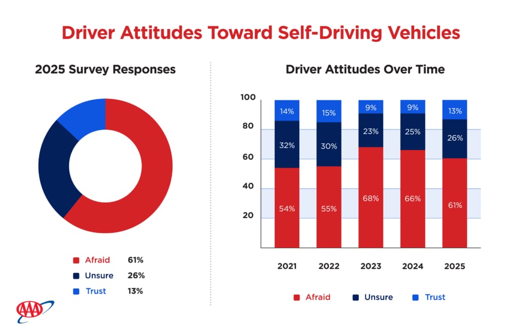 AAA's 2025 survey found that 61% of Americans still fear riding in self-driving vehicles, with only 13% expressing trust in the technology — a marginal increase from 9% in 2024.