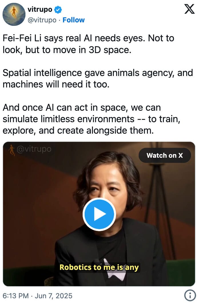 Fei-Fei’s “AI needs eyes” mic-drop: AI-clip curator @vitrupo caught Stanford legend Fei-Fei Li telling a crowd that “real AI needs eyes — not to look, but to move in 3D space.” Her point: language-only models sit in Plato’s cave; true intelligence demands spatial agency so machines can learn like animals in rich, physics-driven worlds.